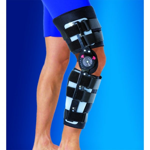 Λειτουργικός μηροκνημιαίος νάρθηκας από επενδεδυμένο αφρώδες υλικό, πλάγιες λάμες αλουμινίου με πολυκεντρική άρθρωση εύρους κάμψης 0-120 μοίρες, έκτασης 0-30 μοίρες, σε διαβάθμιση 10 και 15 μοιρών, με δέστρες για καλύτερη στήριξη. Εύκολο στην τοποθέτηση.